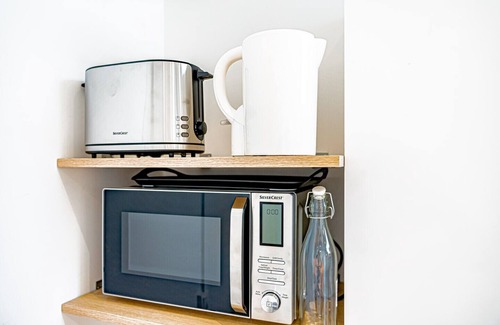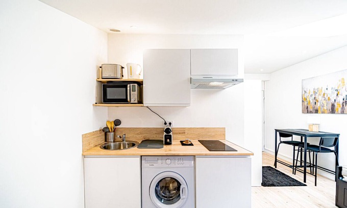 - d’une cuisine équipée d’un petit réfrigérateur, d'un four micro-ondes, d'une plaque de cuisson, d’un lave-linge, d’une machine à café Nespresso, une bouilloire, un grille-pain, de vaisselles et d'ustensiles de cuisine.