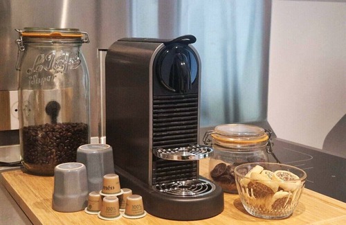 A kitchenette including a fridge, 2 induction hobs, 1 microwave, 1 Nespresso coffee machine, 1 toaster, and 1 electric kettle.