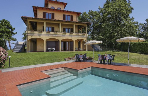 Large manor house "Villa Le Castagne", 400 m a.s.l detached. 4 km from the centre of San Baronto, 15 km from the centre of Pistoia, 52 km from the centre of Florenz, in an elevated position on top of a hill, in the countryside. Private: property 4 ha, large, well-kept garden (not fenced) with lawn and trees, lawn for sunbathing, swimming pool fenced (10 x 5 m, depth 140 - 140 cm, seasonal availability: 10.Apr. - 09.Oct.) with internal staircase. In the house: heating available only from 01.Nov. - 15.Apr. (extra). 500 m long bumpy motor access to the house. Stepped path to the house. Parking (for 3 cars) on the premises. Shop 4 km, supermarket 5 km, bus stop 6 km. Golf course (18 hole) 5 km, tennis 5 km. Cooking courses bookable on request. Local sale of farm products.