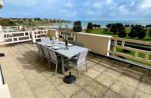 Located in a beautiful art-deco style historical building, with its large terrace overlooking the bay of Saint-Cast and the beach of Pen-Guen. The flat enjoys a truly unique location, at the foot of the beach and the Saint-Cast golf course.