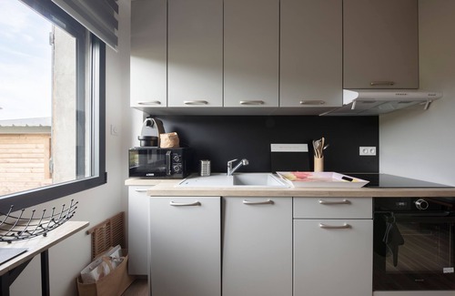 - An open kitchen equipped with electric kettle, oven, microwave, toaster, dishwasher, hotplates, Nespresso pod coffee maker...