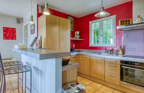 "Le Chêne", 4-room house 105 m2. Comfortable furnishings: large living/dining room with dining table, TV, DVD and air conditioning. Exit to the terrace. 1 room with 1 french bed (160 cm), bathroom and air conditioning. 1 room with 1 bed. 1 room with 1 french bed. Open kitchen (oven, dishwasher, 3 ceramic glass hob hotplates, toaster, kettle, microwave, freezer, electric coffee machine). Shower/WC. Electric heating. 2 terraces. Terrace furniture, barbecue (portable), deck chairs (4), box-room. Facilities: washing machine, iron, children's high chair, baby cot. Internet (WiFi, free). Please note: non-smoking house.