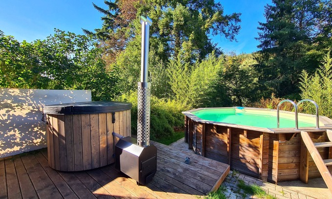 The chalet features a Nordic bath accessible year-round, an outdoor pool open from May to September, and a BBQ. A large wooded and enclosed area provides an ideal space for relaxing in nature. A car-park is also available on site.
