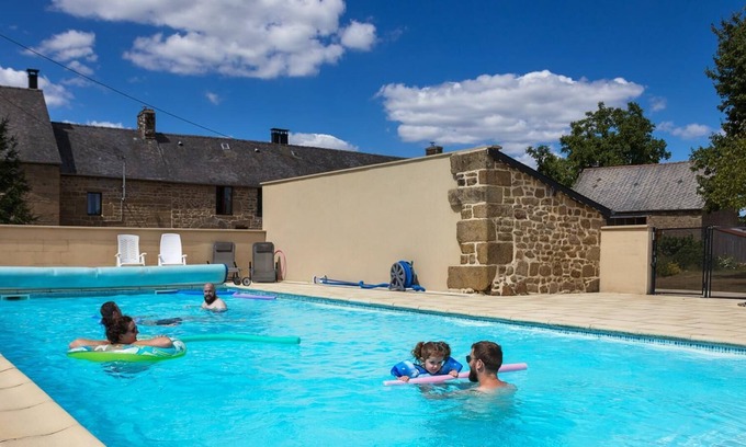 On the ground floor: a living room including a living room with a kitchen and a living room with fireplace. Upstairs: two bedrooms each with a 140X190 bed, a bedroom with two 90X190 bunk beds and a shower room with WC. Parking on the property. Arranged in a beautiful granite farmhouse in the heart of a green estate of 2.5 hectares of gardens with an unobstructed view of rolling farmland. The 4 gites await you for quality stays in an exotic setting conducive to relaxation. Each rental, well equipped, is organized with an entrance on the gravelled courtyard side and a private terrace with table, armchairs and barbecue on the south-facing common garden side with trampoline, swing and bowling alley. The large outdoor heated swimming pool (size: 11.5 x 5 m - depth: 1.45 m) is open from June to September. For your comfort on site: beds are made on arrival and towels are provided.
