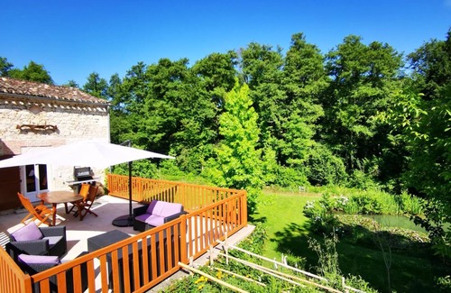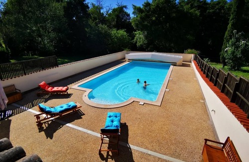 Le Clos des Sources welcomes you at the confluence of three distinctive tourist regions: the Bordeaux vineyards, Périgord (Dordogne), and Agenais (Lot-et-Garonne). This cottage is both secluded and close to essentials. Located within a vast, green, hilly property, the cottage is housed in a detached house in the immediate vicinity of the owners' home. You will have access to the owners' park and swimming pool. Numerous indoor and outdoor games are available (boules, ping-pong, table football, badminton, etc.). A private terrace with garden furniture and barbecue will allow you to enjoy your meals and pleasant moments of relaxation surrounded by nature (garden, woods, 200 m² pond, vineyards, fishing available - with a float - for carp and roach). The cottage is all on one level and has several levels (maximum 4 steps). It consists of a beautiful living room with dining room and lounge, a fully equipped kitchen, a bedroom with a 160x200cm bed facing a bathroom (shower, bathtub, double sink) with separate toilet, a second bedroom with two 90x200cm beds and its own bathroom (shower and toilet), a veranda, and a laundry room (washing machine, dryer, sink). The cottage is equipped with central heating via a heat pump and an additional fireplace insert (1 wheelbarrow of wood provided, additional wheelbarrow for a fee). Parking for two cars. Sheets, towels, and household linen are included, beds made. Private swimming pool (except for maintenance by the owner), 12x6m, depth 1m to 1.70m, access by stairs. Open from April 1st to November 1st until 11:00 p.m. It can be covered or uncovered, allowing it to be used 5 to 6 months of the year. A reinforced socket for recharging electric vehicles is very easily accessible in the gîte's parking lot.
