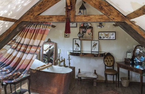 But Le Cocon is not only a feast for the eye. It is also very comfortable and newly renovated. A romantic bedroom with free standing copper bath, good quality mattress and crisp hand-dyed vintage bed linen is under the eaves upstairs and oozes character. Downstairs there is a small, well-equipped kitchen and living-dining room with fireplace and sofa, perfect for lounging on whilst watching a movie. There is also a marbled wet-room with shower and loo.