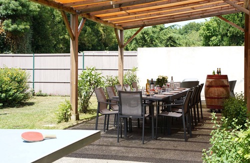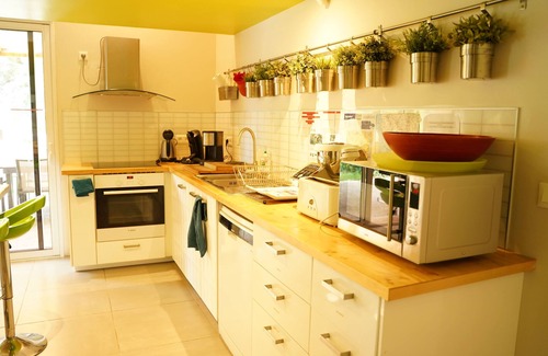 A large Zen-style house that can accommodate up to two families (9 people + cot) with its garden just for you and your children. Spacious very bright living room (57 m2). A master suite with a private bathroom including a spa bath as in an institute (organic essential oils provided). A "perched room" of 15 m2 with 3 individual beds. A large bedroom for a second parental couple with direct access to the upstairs bathroom by private corridor. A small attic bedroom with two beds. Outdoor games (giant chess game, ping pong, basketball hoop). Board games and books or magazines (science and junior life for example) for your children.