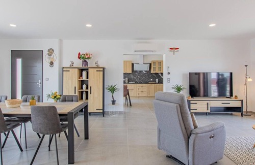 Elegant contemporary villa nestled in a quiet residential area nestled on a gentle hill overlooking a playground (tennis, connected fitness area, city stadium, basketball court, children's games, etc.), a stone's throw from the vineyards & the "town center". Nestled on the banks of the Saône (protected area in "Natura 2000 Zone" for its rich ecosystems), Crêches-sur-Saône has all the amenities (large commercial area located away from the village) as well as numerous sports & leisure facilities including a renowned lake (Port d'Arcia leisure center with supervised swimming & numerous activities) and benefits from a magnificent rolling vineyard landscape setting, combining splendid vineyard hillsides & vast wild forest massifs, rich in sublime panoramic viewpoints over the Val de Saône, the Alps & as far as Mont-Blanc on a clear day! Comfortable spacious luxury gîte. Exceptional 64m² living space. Warm, contemporary Scandinavian style. A calm, Zen atmosphere. Ultra cozy and comfortable. A large, intimate, sheltered terrace under a pergola on the north side opens onto a pleasant garden, offering a beautiful, unobstructed view of the surrounding countryside. This is complemented, on the south side, by a second, exposed terrace nestled in a well-kept paved courtyard. Access to the owners' on-site swimming pool (5x11.5m). Composition: Semi-detached house (with a second gîte) adjacent to the owners' house (complete independence, not overlooked). Fiber optic Wi-Fi. Heat pump heating. Air conditioning (including underfloor cooling). Single storey: living room-kitchen-lounge, 3 bedrooms with TV (double bed 140x190cm / 2 including 2 single beds 90x200cm which can be twinned into a double bed 180x200cm), bathroom (shower/WC), separate WC, laundry room. Double terrace, 1 of which is sheltered under a pergola + mini garden + courtyard + private parking. Bicycle storage + swimming pool (5x11.5m) shared (access during dedicated hours of 9am/12pm & 2pm/6pm). Shops 1 km. Supermarkets 1.5 km.
