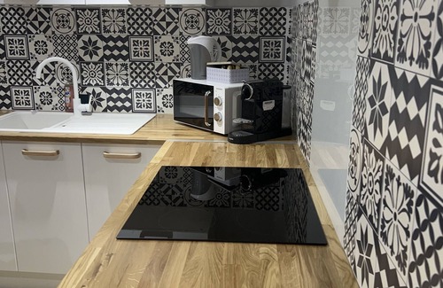The kitchen is fully equipped (crockery, glasses, oven, microwave, kettle, Nespresso coffee machine).