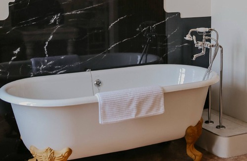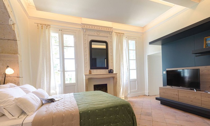 The Sarah suite is named after a young woman who cherished this place that saw her grow up. This room is at the junction of the styles offered by the house, both 19th century with its moldings and balconies and 17th century with its stone alcove and terracotta tiles. It offers a decoration full of character, lit by two windows overlooking the path lined with umbrella pines and cypresses bordering the pond. Its comfortable bathroom features a freestanding bathtub on lion feet and an old washbasin in a neo-retro style.