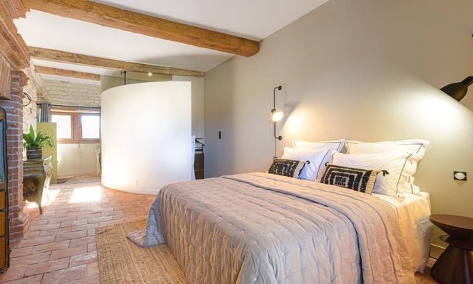 In the Tower, princes and princesses sit on the window cushions to contemplate the view of the Italian courtyard and its dovecote. Under their feet, the tiles keep the imprints of the past that we must try to find, the monumental briquette fireplace shelters their secrets... This suite with a certain charm offers an alcove office area and a modern bathroom designed as a nod to his name.