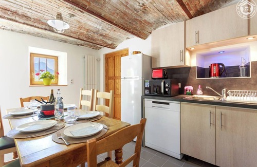 Gite in the House of the owner (independent access) on 3 levels. Ground floor: living room-kitchen, separate toilet. 1st floor: living room, Bluetooth speakers, Wifi connexion. 2nd floor: 2 bedrooms (1 bed 2 people / 2 X 2 bunk beds), a bathroom (shower, 2 basins and WC). Terrace with small garden. Nice not attached private outdoor space (in front of the Gîte). Linen + towels included. Beds made on arrival. Possibility to store skis and bikes in the garage of the owner. Ski the Granier 4.5 km, Planolet/St Pierre de Chartreuse 13.5 km. Cross-country ski the Desert d'Entremont 6.5 km. Beautiful renovated country barn located at the exit of a hamlet, in the heart of the Entremonts Valley, in the Chartreuse Regional natural park. At 4.5 km from the family resort of the Granier and 6.5 km of cross-country ski tracks. Beautiful natural setting on a southeastern slope. Very good comfort with quality equipment. Nice mountain and contemporary style. Beautiful arch in bricks in the kitchen. Nice private outdoor and laid out area. Great panoramic view of the massif.