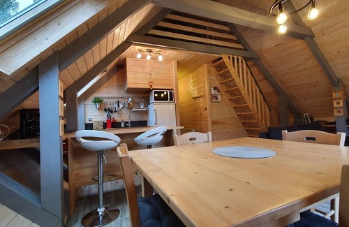 The chalet is made up of a small bedroom and a mezzanine (1.50m at the ridge), both fitted with 160x200 beds, a shower room / wc with shower and 2 sinks.