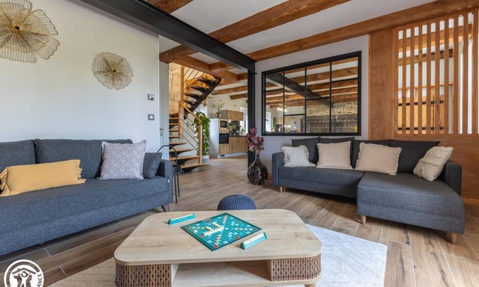 Located in a peaceful and green setting, this cottage is perfect for your reunion with family or friends! Outside, you will find a terrace ideal for al fresco dining and relaxing moments, as well as a garden where you can relax and enjoy the surrounding nature. Inside, the living room is characterized by beautiful exposed beams, combining rustic charm and modernity. The kitchen includes everything needed to prepare delicious meals using modern, high-quality equipment. The large dining table will be ideal for your convivial meals near the pellet stove, creating a cozy atmosphere in winter. The cocooning lounge will be the perfect place to relax while listening to music or playing a board game with others. As for the rooms, they are tastefully decorated, true havens of peace offering optimal comfort. The icing on the cake: the covered jacuzzi, installed in the old bread oven, which offers a unique space for moments of total relaxation. For even more relaxation, you can also enjoy the spa bath. This cottage is the ideal place to spend an unforgettable vacation, whether to relax, explore the region or simply enjoy precious moments with your loved ones. The cottage is composed on the ground floor: -a kitchen with standing eats open to the dining room with pellet stove -a cocooning lounge -a laundry room with everything you need -a separate toilet with hand basin Upstairs: -a bedroom/office with a 2x80 trundle bed -a bedroom with a 160 bed -a bedroom with a 160 bed -a bathroom -a bedroom with two 80cm beds that can be joined together -a bedroom with two 80cm beds that can be joined together -a bathroom/bath with shower and spa bath -a separate toilet with hand basin electric charging station