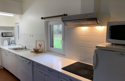 All on ground level: sitting room with fireplace, TV, DVD player, sofa, living room with kitchen area (dishwasher, microwave), fireplace, shower room with washing machine, separate toilet, 1 bedroom with 1 double bed, 1 bedroom with 2 single beds. Electric heating at extra charge. Optional housecleaning service: 30€. Linen rental. Tourist tax. In a green setting, this detached holiday cottage, carefully decorated, welcomes you to a back to basics holiday. You will be able to enjoy the tranquillity of the garden in full view of the horses, go to the sea and visit the famous sites in the area. Private open garden (1200 m²), barbecue.