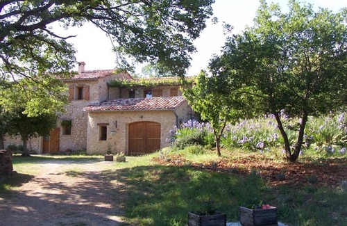 In bastide from the 18th century with three cottages, in an exceptional setting with views of the hills of Barjaude and Beau Soleil, 4 acres of Oaks, lavender, surrounded by terraces, haven of peace. Shaded parking, electric grill, games balls, sandbox, garden furniture. Hiking trails on the spot. Bathing at the Lake of Ste Croix 25 km. Half-floor (outside staircase): kitchen-living room with sofa, two spacious bedrooms in a two single beds (90cm), in one double bed (140cm), wc separated in bathroom. Underfloor heating.