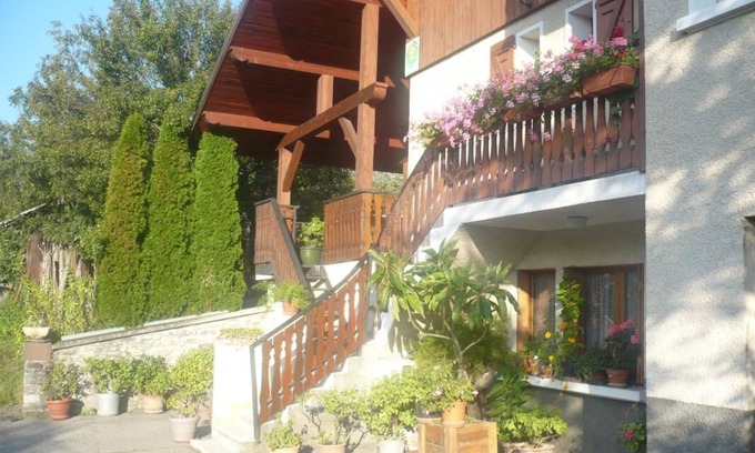 Gîte in the owner's house. 2nd floor: living room-kitchen lounge area (1 double sofa bed), 2 bedrooms (2 double beds 140x190 cm) including one with a small attic mezzanine (1 single bed without foot), shower room (multi-jet shower), separate WC. 2 balconies. Private sheltered terrace. Private courtyard + land. Ski Montalbert / La Plagne 9km, Bourg St Maurice / Les Arcs funicular 11km. Developed lake + leisure center 2km. Beautiful contemporary style house located 9km from the slopes. Quiet residential area at the top of the village. Good comfort. Spacious. Warm mountain character. Double balcony. Large sheltered terrace on the 1st floor. Superb landscaped and flowery outdoor space (swing). Pleasant view of the mountain and the valley.