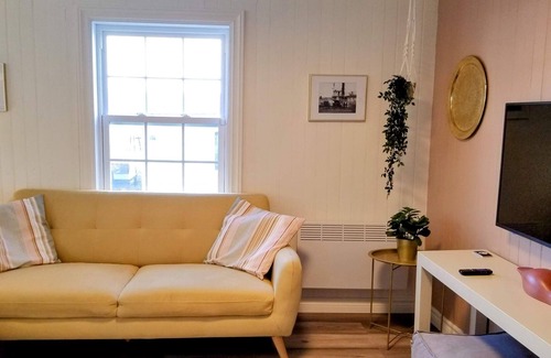 This house built in 1875 was completely renovated in 2022, highlighting its original cachet of yesteryear with its original lathe paneling. It is small, but no amenity was spared. The fully equipped kitchen also includes a laundry stack. The living room has a Roku smart TV. The bathroom has a bath-shower. The bedrooms are upstairs with a low wraparound ceiling. The master bedroom has a large cozy bed and a desk for remote work. The small bedroom has two single beds.