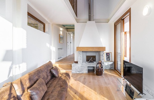 The front door, located on the municipal road, leads into the large double-height area that includes the ground floor and the lower floor. The house has three floors. The ground floor entrance welcomes guests to a view of the double height on the lower dining area and a hallway with a wooden staircase leading to the lower floor and the upper floor; on the right the sitting area with fireplace has direct outside access to the covered portico, to the balcony and to the uncovered terrace; on the left is the guest bathroom and foot access to the garage. The beautiful illuminated wooden staircase leads down to the lower floor with the spacious dining/kitchen area with fireplace, laundry room and guest bathroom. Multiple French windows lead directly out to the outdoor area, the pool, the garden and the independent studio flat: this latter includes a small open kitchen with peninsula and a living area with double sofa bed (with regular mattress), vestibule and a bathroom with shower. Set in the house, for use of the pool, is an open changing room with a hot-water shower. From the main entrance, the staircase also leads to the upper floor, with bleached exposed-beam ceilings: here are the three double bedrooms with incomparable views, all with en-suite bathroom, TV and minibar. To the left of the staircase, a short corridor leads to the master bedroom, “Aria”, with balcony and a safe and ensuite bathroom with shower. On the right a corridor leads to the double bedroom “Acqua”,with en-suite bathroom with shower, and then on to the double bedroom “Terra”, with balcony and en-suite bathroom with tub/shower. Air conditioning and heating all over the villa by domotic system.