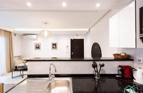 New apartment in a very high-end residence. This accommodation is ideally located in the Jardins de Carthage, close to all amenities. It can accommodate 2 people. It was fully refurbished in March 2022. It consists of a bedroom with a double bed, a living room with an open kitchen and bar. Smart TV, high-speed internet. The residence is less than 5 minutes from Lac 2, Carthage, Sidi Bou Said and a little less than 10 minutes from La Marsa beach.