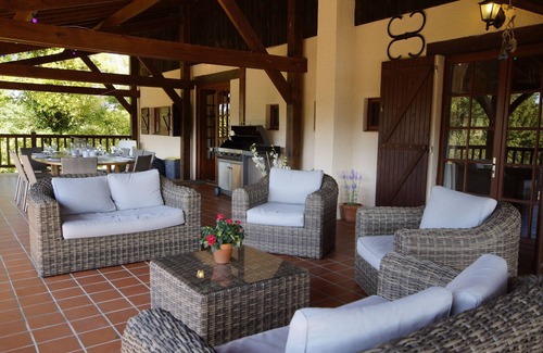 Secluded covered veranda overlooking the countryside. Sitting area with 2 sofas, 2 chairs. Dining area with large table and chairs, console table and barbecue. Sunbathing area has sun loungers.