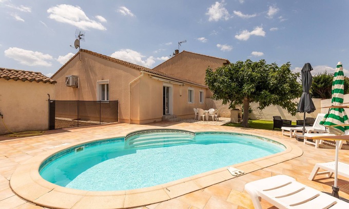 Cocoonr/Book&Pay agency offers this charming, air-conditioned, single-story house with a pool for rent in Sauvian. It has a surface area of 90 m² and can accommodate up to 6 guests. It comprises a lovely 39 m² living room, a fully equipped kitchen, three beautiful bedrooms, a bathroom (with shower), and you can enjoy a garden of approximately 417 m². Wi-Fi included, we are waiting for you!