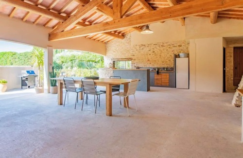 Pool house 80mq with full summer kitchen (fridge, hotplates, barbecue) and WC. Mas "Le Mas des Buis", renovated in 2016. In the resort 1.5 km from the centre of Uchaux. Private: property 4'500 m2 (fenced), swimming pool (10 x 5 m, depth 140 - 140 cm, seasonal availability: 01.Jun. - 30.Sep.). Linen change weekly. Towel change weekly. Room cleaning weekly (included). Parking on the premises. Shop 1.5 km, supermarket 5 km, restaurant 500 m, bakery 150 m, bus stop "Centre Serignan du Comtat" 4.3 km. Nearby attractions: Orange 8 km, Vaison la Romaine 32 km, Avignon 41 km, Mont Ventoux 62 km. Please note: car recommended. Suitable for families.