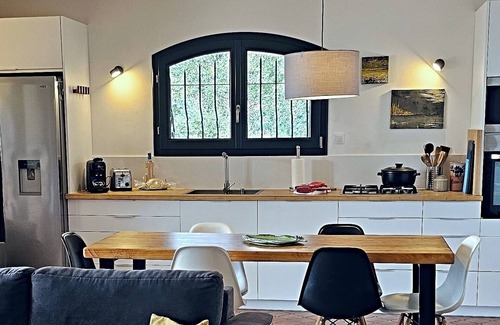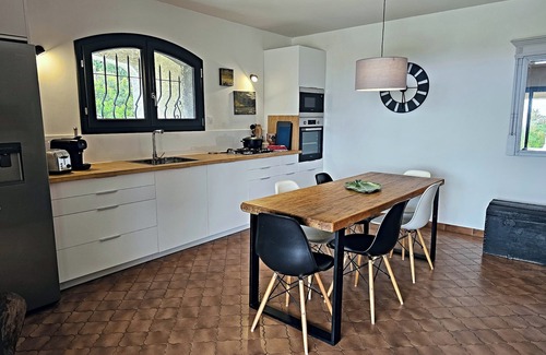 The kitchen is very well equipped: American fridge (freezer, water dispenser, ice maker), dishwasher, double compartment oven, microwave, 4-burner gas hob, Nespresso capsule espresso machine/l'Or du café, toaster, kettle etc.