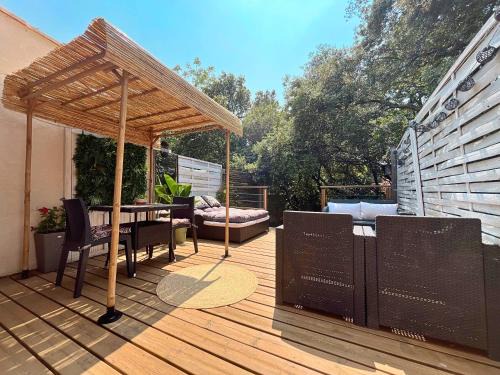 Le Mazet L'intimiste Les Hauts de Nîmes is a recently renovated vacation home in Nîmes where guests can make the most of the garden and barbecue facilities. This property offers access to a terrace, free private parking, and free Wifi. Parc Expo Nîmes is 7.8 miles away and Arles Amphitheatre is 26 miles from the vacation home. The air-conditioned vacation home consists of 1 bedroom, a living room, a fully equipped kitchen with an oven and a coffee machine, and 1 bathroom with a walk-in shower and a hair dryer. A flat-screen TV with streaming services and a game console are featured. The property has an outdoor dining area. Guests at the vacation home will be able to enjoy activities in and around Nîmes, like cycling, hiking, and walking tours. Nimes-Ales-Camargue-Cevennes Airport is 15 miles away.