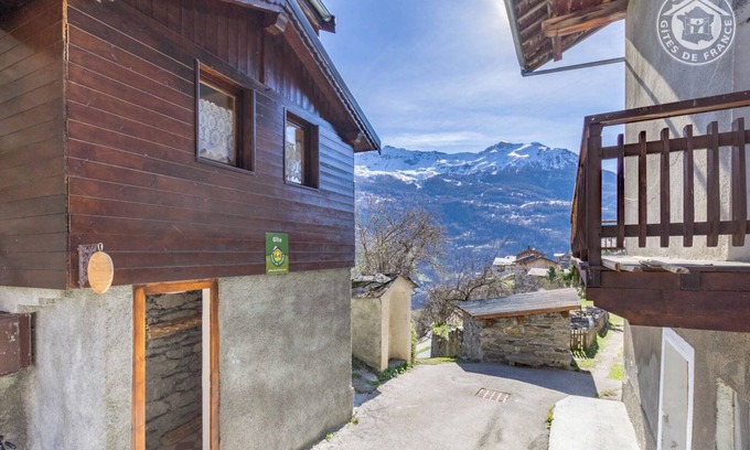 Village house carefully renovated on 3 levels. Ground floor: bathroom (height less than 1 m 80) with bath + WC. 1st floor: fully equipped kitchen with dining room. Living room (sofa convertible bed 2 people) + wardrobe space. 2nd floor: mezzanine bedroom (1 bed 2 people in 160 x 200). Linen included and bed made. Towels and linens included. Public parking nearby. Private terrace with lovely views of the Valley and the mountain. Village house located 300 m from the slopes (Paradiski area). Quiet charming typical village of Savoie and residential sector. Immediate environment of Prairie and forest quality. Good comfort. Decoration with romantic atmosphere. Rental SUNDAY - SUNDAY (except summer).