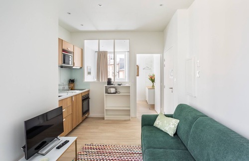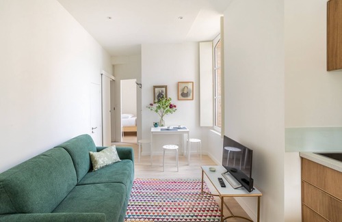 The flat is ideally located in the hypercentre of Rennes, close to the Jacobins Convent, Place Hoche and one of the city's commercial arteries, this accommodation is ideally placed courtyard side of a quiet pedestrian street despite its strategic location. With 3 different sleeping arrangements available, it can comfortably accommodate 4 people.