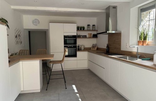 The fully equipped kitchen overlooks the garden and the swimming pool, offering a soothing view. It is completed by an outdoor barbecue area, ideal for enjoying the garden.