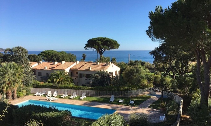 Completely renovated in 2018, this apartment overlooking the sea and pool is located on the 1st floor of a residence with swimming pool and tennis. It consists of a living room with sofa bed, a bedroom and a mezzanine with 2 single beds (to bring closer if necessary to make 1 double bed), a fully equipped kitchenette, a shower room and separate wc.