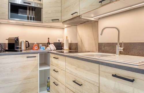 The separate, fully-equipped kitchen is an inviting place to sit around a table for two. It features top-of-the-range appliances: fridge, induction hob, dishwasher, microwave, extractor hood, Nespresso coffee machine, toaster, kettle and everything else you need to cook with pleasure.