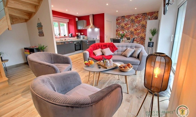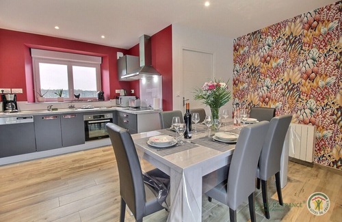 Ground floor: fitted kitchen, living room, one bedroom (1 queen-size bed) with private bathroom (shower), toilet. Upstairs: landing with children's play area, office, two bedrooms (4 single beds (90x190cm) that can be joined into king-size beds), bathroom with bathtub, toilet. Outdoors: two private terraces, each 25 m². Private enclosed garden of 100 m². Parking for two vehicles is available in front of the house. Outdoor spa for 6 people, available year-round (4 bathrobes provided). Electric charging stations are available in supermarkets 5 minutes from the cottage. You will not remain indifferent to this address, adjoining third parties, which offers you beautiful services: contemporary furniture added to a refined decoration ... And since vacations are also about having moments of relaxation, what could be more pleasant than relaxing in the private outdoor spa which will be at your disposal? Looking for discoveries during your stay? You are 70 m from the owners' cattle farm who will be happy to show you around their farm if you wish!