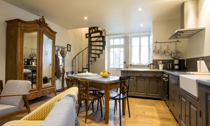 On the ground floor: large living room with fully fitted and equipped kitchen (fridge, oven, dishwasher, coffee maker, kettle ...), lounge with sofa and TV. You will reach the floor by a beautiful spiral staircase.