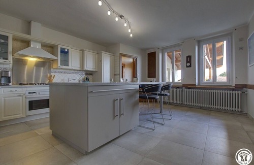 In the heart of the hamlet of Rignat, the gîte Le Perroux has been renovated and offers accommodation for a capacity of 6 people, with its 3 bedrooms. From the common courtyard, by an exterior stone staircase, you access a large wooden and covered terrace. The main entrance is through a hall; a large kitchen equipped with island, dining room; 5 steps higher, a relaxation lounge and a first bedroom with a double bed 140 * 190. A laundry room is at your disposal with sink and washing machine; Italian bathroom and separate toilet. Two additional bedrooms, one with two single beds and the second bedroom with a double bed. A games room gives direct access to the large covered terrace with garden furniture and deckchairs. Wood heating, heat pump and fuel oil. The plus of this cottage: everything is included (beds made on arrival, towels provided and heating included). To discover the gorges of the Rivière d'Ain, 200 km long, ideal space for sports holidays (vertigo trails, hiking) or with the family. Very beautiful points of view to enjoy the limestone cliffs. About 12 km away, Bourg en Bresse with its Royal Monastery of Brou.