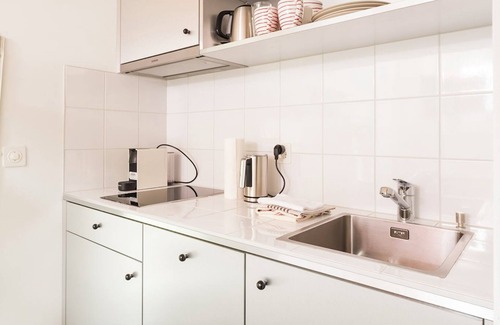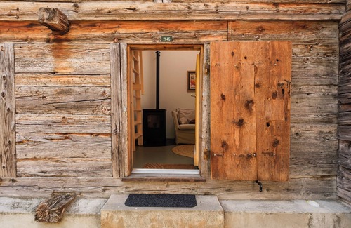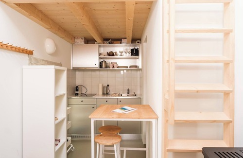 This traditional Swiss hut offers a cosy studio room which includes a kitchen, a table with barstools and a lounge area with armchairs. The bathroom is ajdacent. The 1,60 cm double matrace is "maisonette-style" and reachable with a ladder from the living room, therefore not suitable fo people who struggle with mobility. There is modern pellet oven, perfect to relax after a long day of skiing.