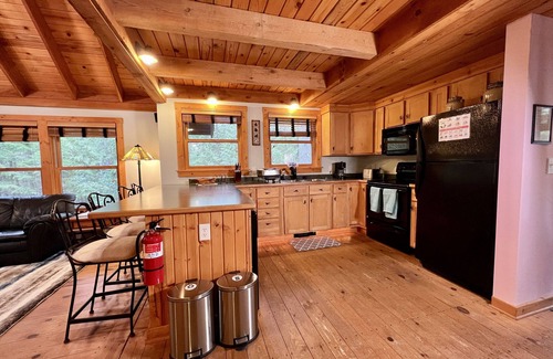 Le Petit Chalet features an airy, open concept layout. The main level features a spacious master bedroom with Queen bed that walks out to the screen porch. Upstairs features a 3/4 bath with Queen lofted bedroom that overlooks the fireplace and living room below. Living room boasts seating for 4 and Roku TV. Full kitchen with breakfast bar is perfect for entertaining. Living area extends into large screen porch with formal dining space.