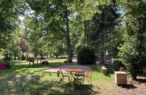 Authentic 1828 manor house, carefully renovated into an ultra-comfortable holiday home, located in a quiet area in the rolling Brionnais countryside in the heart of a peaceful little typical village. Nestled around a large central square with old-world charm (a famous former livestock market), in the hollow of the gentle Arcon valley bordering the Loire Valley, this picturesque village benefits from a splendid preserved rural & natural setting of sublime bocage dotted with bucolic rivers & small wild forests. Very comfortable gîte. Ultra spacious. Beautiful volumes. Very elegant "bourgeois" character with contemporary accents. A luxurious & refined atmosphere enhanced by the exotic soul of the original building (exceptional painted & stained glass ceilings, moldings, rosettes, glass doors, cement tiles, parquet flooring, etc.). Lots of charm & character. Cozy & cozy. Intimate enclosed park (7500m²) with century-old trees including an original semi-buried circular swimming pool, ping-pong table & pétanque court, offering a beautiful unobstructed view of the surrounding countryside (including the Forez mountain range in the background), nestled on the edge of a vast pasture welcoming the famous Charolais cows in season. Composition: Detached house next to the owners' house (total independence). Wifi. Wood central heating (wood stove as an extra in the kitchen). Ground floor: kitchen, living room, lounge, games room (table football), separate toilet. 1st floor: 6 bedrooms (2 with 1 double bed 160x200cm / 2 single beds 90x200cm that can be twinned into a double bed 180x200cm + single bed 120x200cm / 5 single beds 90x200cm including 2 x 2 bunk beds / double bed 160x200cm + single bed 90x200cm / 3 single beds 90x200cm including 2 that can be twinned) including 3 with private bathrooms (bathtub - shower - "retro" bathtub converted into a shower / 2 with toilet), shower room (shower/toilet), shower room (shower), separate toilet. Enclosed park (ping-pong & pétanque) + semi-buried swimming pool (10m diameter) + private parking. Supermarkets 9 km away. Amenities 13 km.