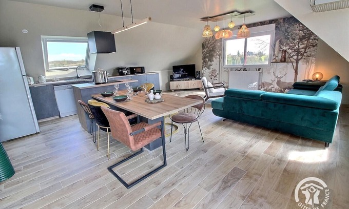 Your elevated vacation apartment is spread over a single level: - Upstairs: Beautiful 41 m² room, including the kitchen-diner, the living room, A laundry room with washing machine, A bedroom with a queen-size bed, Another bedroom with a queen-size bed, A bathroom with shower, A separate toilet with washbasin. - Outdoors: Two terraces, one raised at the entrance to the cottage with an outdoor relaxation area and the second below the stairs with garden furniture, an 80 m² lawn, and a private 150 m² gravelled courtyard with space for two cars. Planting is currently being done on the slopes along the driveway leading to the cottage. Private spa accessible year-round. Accommodation reserved for leisure guests. Don't delay in booking your stay in the countryside, come and discover for yourself the incomparable charm of this apartment carefully furnished by an interior designer. You will be seduced from the first glance, by its refined design, by its pendant lights which bring a touch of elegance and originality, while the panoramic wallpaper creates a warm and welcoming atmosphere. The apartment is located upstairs, above the owner's garages; who lives next door, each with their own private entrance. The Pont-Querra nature sports base in Plémet, 19 km away, is backed by the banks of the Lié and close to the V6 greenway Carhaix – Saint-Méen-le-Grand and the Loudéac forest, this base offers a multitude of sports leisure activities to practice in a group or with the family: canoeing, water hiking, Nordic walking, stand-up paddle, mountain biking, archery, etc.