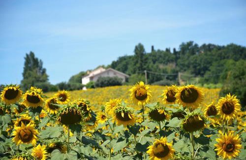 - Cozy country house with infinity pool and surrounded by sunflowers .