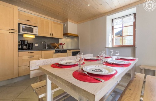 5 cottages in the House. Ground floor: kitchen corner living room (1 sofa bed), washing machine + dryer common pay at the Town Hall (provided laundry), 2 bedrooms (1 double bed 2 p./2 beds 1 p.), s. (bath). Shared terrace. Ski St François-Longchamp or Seythenex. Snowshoeing on site. Waterbody St Alban of Hurtières 19km. Former rectory in the heart of a charming typical village in a beautiful circus of mountains. Natural unspoilt between pastures and forests. Self catering holiday rental nice and bright. Large common terrace. Beautiful unobstructed view of the village and the mountains. Shops & services at Aiguebelle.