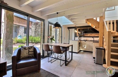 Your holiday rental includes on the ground floor: living room with fitted kitchen, 1 bathroom (beautiful walk-in shower) and separate toilet. Upstairs: landing leading to 2 bedrooms (1 bed 160x200) and (2 beds 90x200). Private terrace of 15 m² and landscaped shared garden of 400 m². Parking in free public car park 100 m away, access to the property to unload vehicle. On the heights of Binic, in the heart of the old Beaumont district, this old farm from 1850 built on a plot of 800 m² has just undergone a very elegant renovation, favoring quality materials and bringing great care to the decoration. La Ferme du Ponant is distinguished by its layout around a large square courtyard including 3 gîtes with luxury services. You will stay in the Rivage gîte, with chic decoration, distinguished by a subtle mix of contemporary furniture blending perfectly with the exposed beams and stone pillars: a cocooning atmosphere guaranteed. Young and old can meet on the landscaped grounds including a convivial area (large shared barbecue) and a children's area. Ideal holiday location: the Corps de Garde beach is 600 m away by a path, the GR 34 also. Binic, its marina and the family beach of La Banche are 1.5 km away as well as the shopping center 1.5 km away.