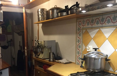 The kitchen is equipped with an oven, a stovetop, and a refrigerator, as well as a coffee maker, an electric kettle, and a microwave. And because there's a washing machine, you can go a bit lighter on your packing. Other amenities include a BBQ grill, an ironing board, and heating.