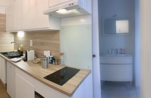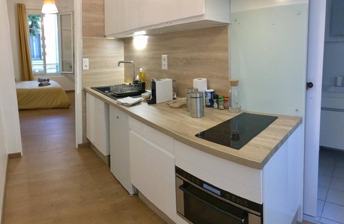 This 28m² flat is composed of a nice room with a double bed, a fully equipped kitchen, a modern bathroom with a shower. There is a flat screen TV and WIFI in the whole flat.