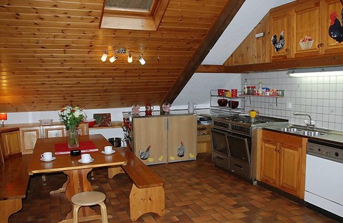 "Le Sorbier", 5-room penthouse 95 m2 on 2 levels on 1st floor. Spacious, with sloping ceilings, comfortable and rustic furnishings: open large living/dining room with sloping ceilings with open-hearth fireplace, dining table and dining nook. 1 double bedroom with 1 x 2 bunk beds (90 cm, length 170 cm), 1 double bed. 1 room with 2 beds. Open kitchen (4 hot plates, oven, dishwasher, microwave, electric coffee machine, fondue Set (cheese)). 2 showers/WC. Heating. Upper floor: 1 room with sloping ceilings with 1 x 2 bunk beds (90 cm, length 170 cm), 1 french bed (140 cm). 1 room with sloping ceilings with 2 beds (90 cm, length 200 cm). Terrace furniture, barbecue. Facilities: baby cot. Internet (WiFi, free). Blu-ray player. Reserved parking (2 cars) at the house. Please note: non-smokers only. Maximum 1 pet/ dog allowed.