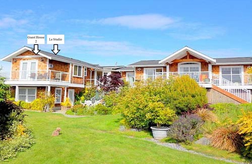 Le Studio features a clean, private, self contained studio apartment with expansive views, beach, queen bed, fireplace, view deck, bbq, big garden, fire pits, well stocked kitchen with dishwasher, fridge, soaking tub, shower, sitting and dining areas, comfortable, charming decor. The upstairs studio apartment of the Guest House.