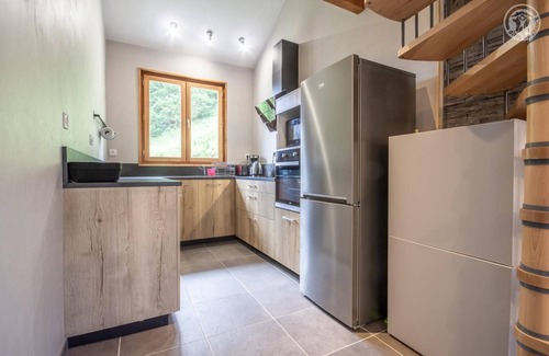 Apartment located on the first floor of a condominium. Living room-living room-kitchen (1 convertible sofa 140x190 cm). 1 bathroom (shower + WC). Balcony. On the first floor in the apartment: 2 bedrooms (3 single beds 90x190 cm including 1 bunk bed / 1 double bed 160x190 cm). 1 bathroom with WC. Shuttle at 100 m. Yvon has put all his heart into restoring the charm of this former family home, modern and warm. A few meters from the village square, overlooked by the summit of La Tierce, the narrow balcony bathed in light invites you to contemplate the surrounding mountains. Inside, the slate wall blends perfectly with contemporary materials. A great address for a 100% natural stay!