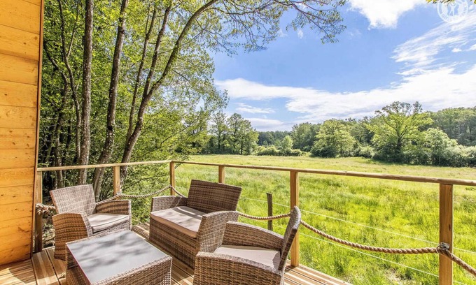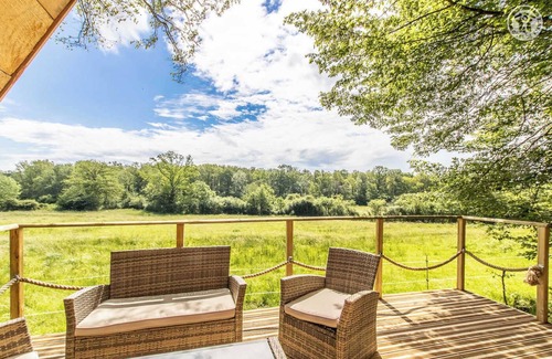 Managers of the "Ferme des Animaux des Petits Bois" located 12 km away (exhibition farm with more than a hundred species of domestic animals & activities for the whole family), Sonia & Jean-Baptiste welcome you to their an unusual charming "teepee" hut - composed of 2 communicating modules, by an original "gut" tunnel for the pleasure of adventurers! - nestled in the middle of the forest on the edge of a bucolic green meadow where their horses graze. Absolutely magical & enchanting setting, nestled "under the trees" in the hollow of a sublime preserved setting of nature & greenery (the privilege of being able to observe wildlife). Private property of 30 ha offering a vast forest (perfectly maintained with walking paths & zip line), a 1 ha ("no-kill") fishing pond, a river full of fish, a "well-being" area with paid access ( spa & sauna) and a children's play area (slide/climbing/hut). Very good comfort. Warm wooded character. Zen & soft atmosphere. Pleasant panoramic balcony-terrace exposed, offering a superb unobstructed view. Wonderful landscape. Large natural "forest" private land (not overlooked). Composition: Estate comprising 3 gites including 2 unusual ones (access by 300m of stony road suitable for vehicles). Ground floor: living room (conv. 1 p. 120x190cm as an extra), 1 bedroom (2 single beds 90x190cm) with exterior or interior access (mini tunnel). 1st fl. : sleeping area on the mezzanine (unsecured / access to African ladder / bed 2 p. 160x200cm). Photovoltaic electricity (12 volt supply) + water reserve (sink / 5 litres). No heating. Dry toilet outside (Wc). Complete kitchen area + private bathroom (shower/WC) fitted out in the central building of the estate 200m away ("shared" area with second unusual gîte) including a large living room and "well-being" area with paid access & dedicated hours (4-person spa / 2-person sauna / shower). Private balcony-terrace + land + parking. Domain 30 ha in common. Amenities 8 km.